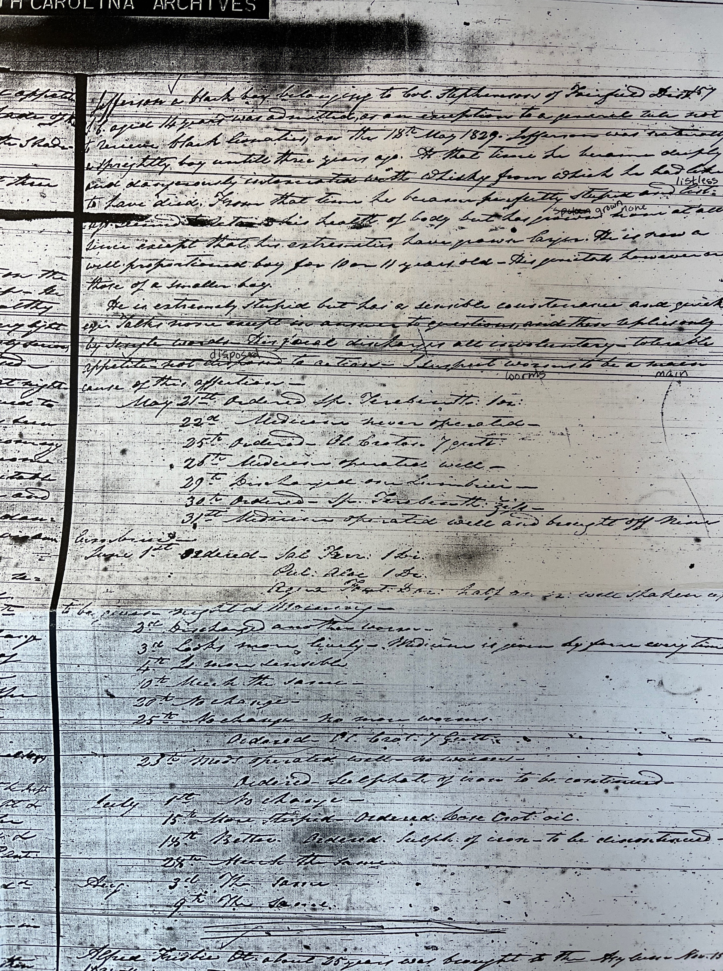 "Jefferson a black boy belonging to the Col. Stephanson of Fairfield Distr 157 S.C. aged 14 years was admitted as an exception to a general rule not to receive black lunatics, on the 18th May 1829. Jefferson was naturally a sprightly boy until three years ago. In that time he became deeply and dangerously intoxicated with whiskey from which he had like to have died. From that time he became perfectly stupid and listless. He seemed to regain health of body but has grown none at all since except that his extremities have grown larger. He is now a well-proportioned boy for 10 or 11 years old - his genitals, however, are that of a smaller boy.